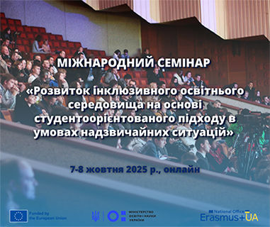 Національний Еразмус+ офіс в Україні спільно з Міністерством освіти і науки України та командою Національних експертів з реформування вищої освіти Програми ЄС Еразмус+ (HERE team) запрошують до участі в міжнародному семінарі «Розвиток інклюзивного освітнього середовища на основі студентоорієнтованого підходу в умовах надзвичайних ситуацій», що відбудеться 7-8 жовтня 2025 р. в онлайн форматі за підтримки SPHERE, EACEA та за участі експертки TAM (Технічної місії з підтримки Програми Erasmus+) – д-р Жанін Ґреґерсен-Германс.