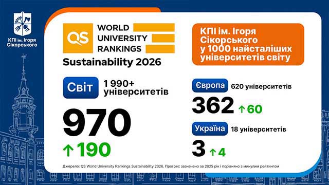 The Igor Sikorsky Kyiv Polytechnic Institute has been ranked among the 1,000 most sustainable universities in the world, according to 2026 QS Sustainability Rankings. This year, the university has made significant progress and strengthened its position across all categories used to assess institutions.